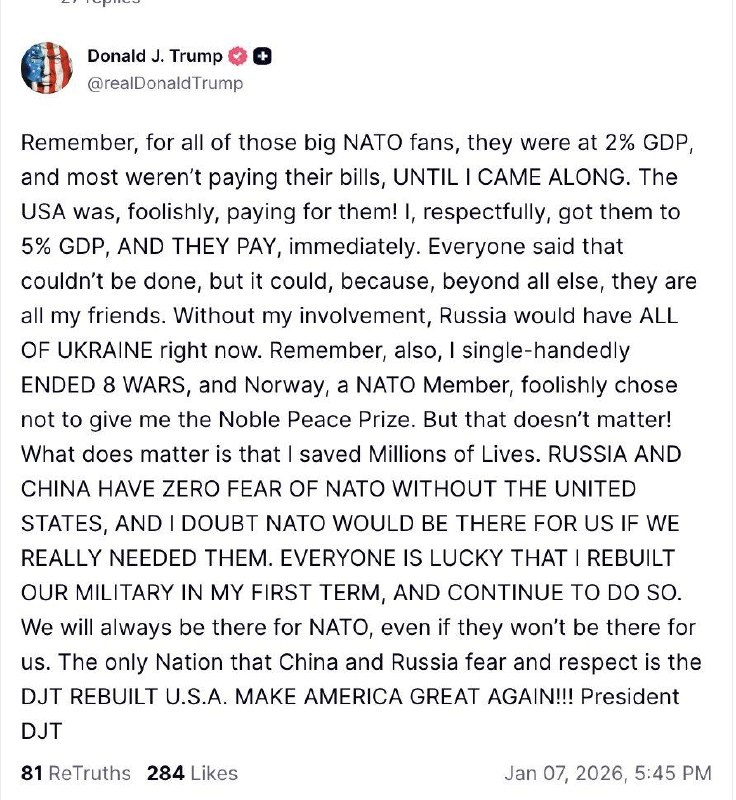 "Помните, для всех этих ярых фанатов НАТО, они отдавали 2% ВВП, и большинство из них не платили по счетам, пока не появился я. По глупости, за них платили США! Я, со всем уважением, довел их до 5% ВВП, и они их платят. Все говорили, что это невозможно, но это возможно, потому что, помимо всего прочего, все они мои друзья. Без моего участия Россия сейчас захватила бы всю Украину. Помните также, что я в одиночку положил конец войнам, и Норвегия, член НАТО, по глупости решила не присуждать мне Нобелевскую премию мира. Но это не имеет значения! Важно то, что я спас миллионы жизней. Россия и Китая не боятся НАТО без США, и я сомневаюсь, что НАТО поддержало бы нас, если бы мы действительно в них нуждались. Всем повезло, что я перестроил наши ВС в свой первый президентский срок и продолжаю это делать. Мы всегда будем поддерживать НАТО, даже если они не будут поддерживать нас. Единственная нация, которую Китай и Россия боятся и уважают, - это США", — написал Трамп в Truth Social. 🔴 Читайте