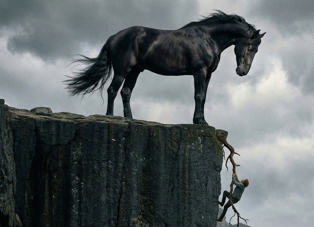 На самом краю, когда мелкие камушки уже сыпались в бездну, Вихрь сделал невозможное. Он вонзил задние копыта в землю, пропахивая глубокие борозды, сел на скакательные суставы и резко, всем корпусом, развернулся на месте на сто восемьдесят градусов.