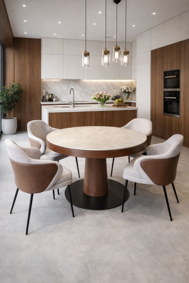Обеденный раздвижной стол с керамогранитом и шпоном и стильные удобные стулья с тканью и экокожей