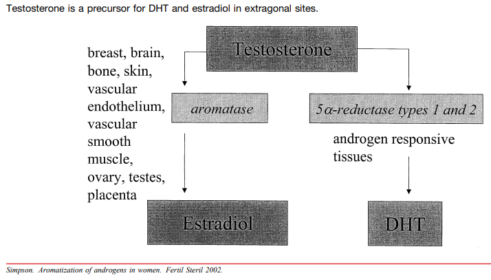Вот перевод предоставленного документа (Simpson, 2002), посвященного роли андрогенов в синтезе эстрогенов у женщин Эван Р. Симпсон, Ph.D. Институт медицинских исследований принца Генри, Клейтон, Виктория, Австралия Тестостерон можно рассматривать как циркулирующий прогормон, который в тканях-мишенях конвертируется: У женщин в постменопаузе концентрация тестостерона в крови на порядок выше, чем концентрация эстрадиола Только около 25% циркулирующего тестостерона секретируется напрямую яичниками. Остальное формируется из предшественников, вырабатываемых надпочечниками и яичниками: Внеобратимый синтез эстрогенов имеет две ключевые особенности: Традиционно считалось, что возрастные изменения (потеря плотности костей, когнитивные нарушения) — это прямой результат дефицита эстрогенов. Однако данные показывают, что эти процессы могут быть следствием недостатка циркулирующих андрогенов, которые служат обязательным сырьем для местного производства эстрогенов в тканях. Оригинал текста можно
