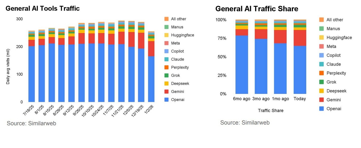 ⚡ Gemini занял 20% рынка веб-трафика ИИ-чатов — ChatGPT впервые падает