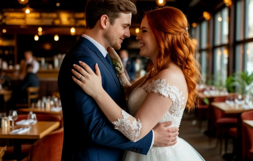 Виктор ждал у входа в банкетный зал — в строгом костюме, с белой розой в петлице, с дрожащими руками. Когда Ирина вышла к нему в белом платье, он замер, не в силах произнести ни слова.