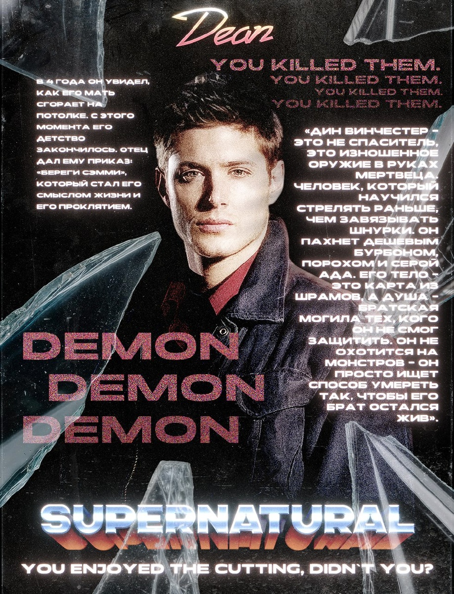 🩸 🩸🩸🩸🩸🩸❓ ✖️Постер на тематику сериала "Сверхъестественное" ✖️ А кстати, сорян за длинное отсутствие, с Photoshop-ом беды. ——————— Дин Винчестер — это не спаситель, это изношенное оружие в руках мертвеца. Человек, который научился стрелять раньше, чем завязывать шнурки. Он пахнет дешевым бурбоном, порохом и серой Ада. Его тело — это карта из шрамов, а душа — братская могила тех, кого он не смог защитить. Он не охотится на монстров — он просто ищет способ умереть так, чтобы его брат остался жив. ——————— #Постер | Заказать дизайн // Реклама // Буст | SpamNext - бот для пранков. ProNext