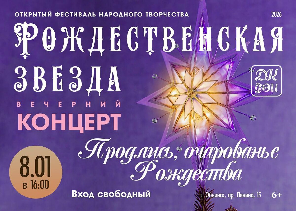 »! 8 января в ДК ФЭИ пройдёт вечерний концерт «Продлись, очарование Рождества». Это часть открытого фестиваля народного творчества «Рождественская звезда». Ежегодно событие объединяет творческие коллективы и солистов со всей Калужской области. Они представят яркие выступления, посвящённые светлому празднику Рождества Христова. Также гостей фестиваля ждёт увлекательная ярмарка и традиционная выставка прикладного творчества. «Рождественская звезда» – это настоящий праздник народной культуры, дающий возможность прикоснуться к традициям. Начало в 16:00. Вход свободный.
