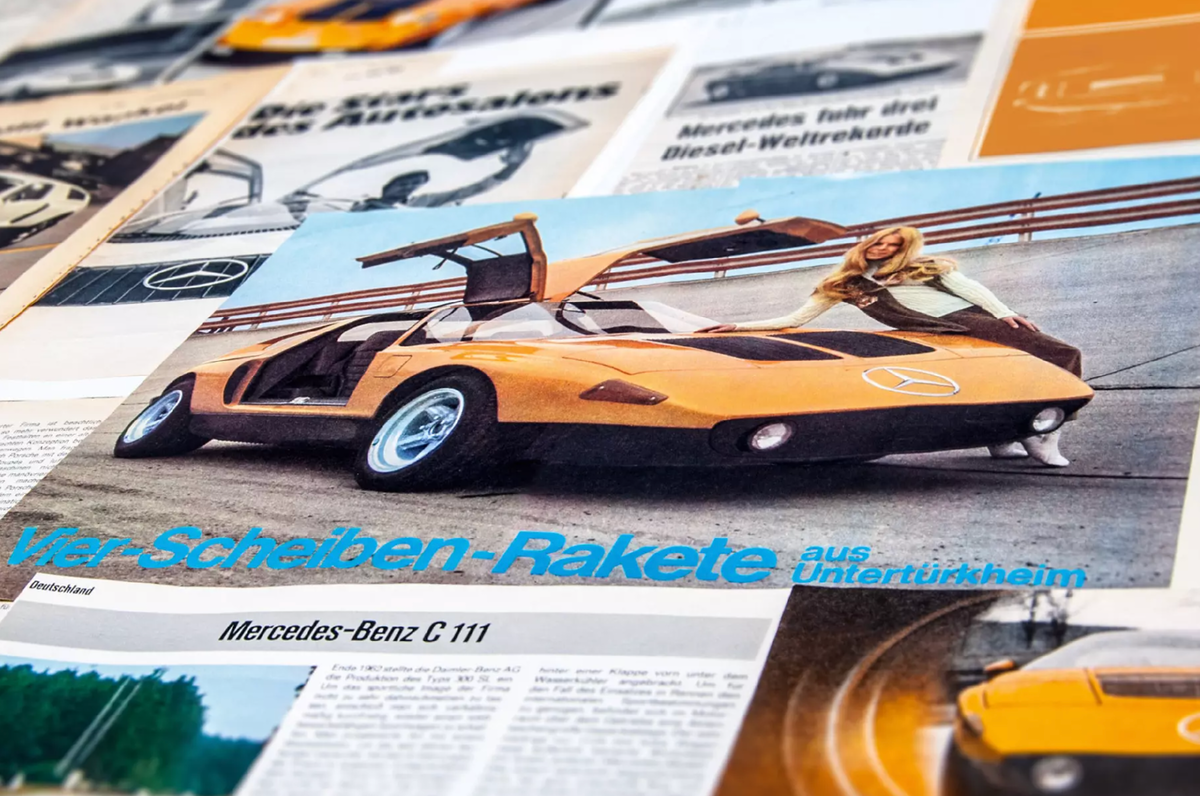 Обычно концепт-кар живет один раз: вспыхнул на автосалоне, собрал бурные овации и перекочевал в рубрику "а помните вот это?". C111 пошел другой тропой. В источниках фигурирует 16 Mercedes C111 всех типов — от ротора до дизеля и битурбо V8. История началась сразу после ухода 300 SL: в начале 60-х студии в Штутгарте поручили придумать идейного наследника "Крыла чайки". Молодой тогда Бруно Сакко выдал проект SLX, аккуратное среднемоторное купе, которое так и осталось в тени, но стало черновиком для будущего C111. А вот когда в 1969 на Франкфурте показали оранжевый клин с дверями "крыло чайки" и стеклопластиковым кузовом, именуемым "розовым вином" (официальное название Weissherbst), Mercedes завалили письмами. Коллекционеры присылали даже бланковые чеки, намекая, что готовы заплатить почти любые деньги, но в Штутгарте сразу дали понять, что C111 в продажу не пойдет. Первый C111 получил трехсекционный роторный Wankel на 280 л.с., вес около 1100 кг и максимум 260 км/ч. Для конца 60-х это