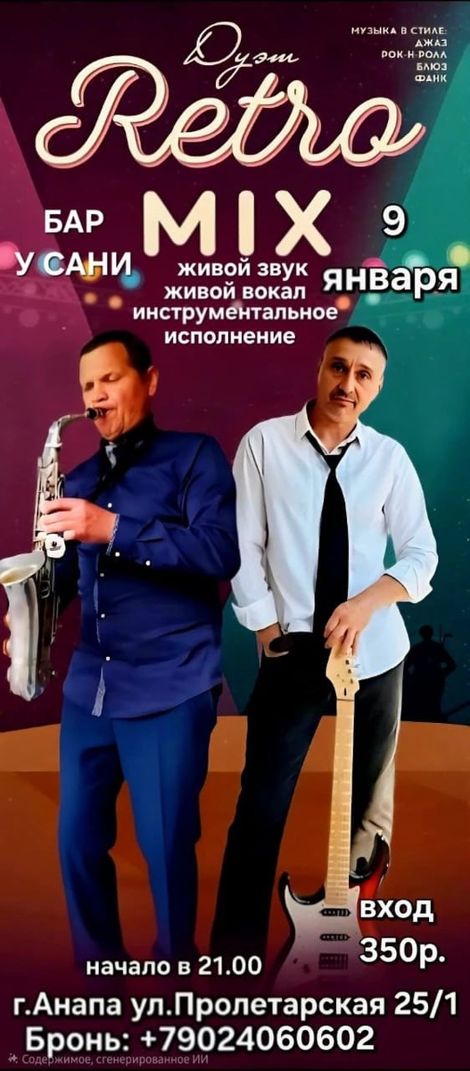✌️ Кавер-дуэт "Ретромикс" приглашает вас послушать и вспомнить старые добрые супер-хиты разных эпох, полюбившихся во всем мире. В программе: инструментальные композиции, песни российских и зарубежных исполнителей таких как, Элвис Пресли, гр. Браво, Рой Орбисон и многих других, а сочетание саксофона и электрогитары создаст особый колорит музыкального вечера. Такое в нашем баре в первые 🥳🤗 🗓9 января, Бар "У Сани", начало в 21:00 📲Бронь мест: 8-902-406-06-02 ❗️Вход 350 руб. Представляем вашему вниманию группу "Старый Баркас". Они как всегда в классном зажигательном исполнении будут петь всеми любимые хиты русского рока 🤟🤟🤟 🗓10 января, Бар "У Сани", начало в 20:00 📲Бронь 8-902-406-06-02 ❗️Вход 400 руб. 📍Анапа ул. Пролетарская, 25/1, БАР "У САНИ" Розыгрыш по традиции от нашего заведения 🎁 18+ Новости Анапы в MAX