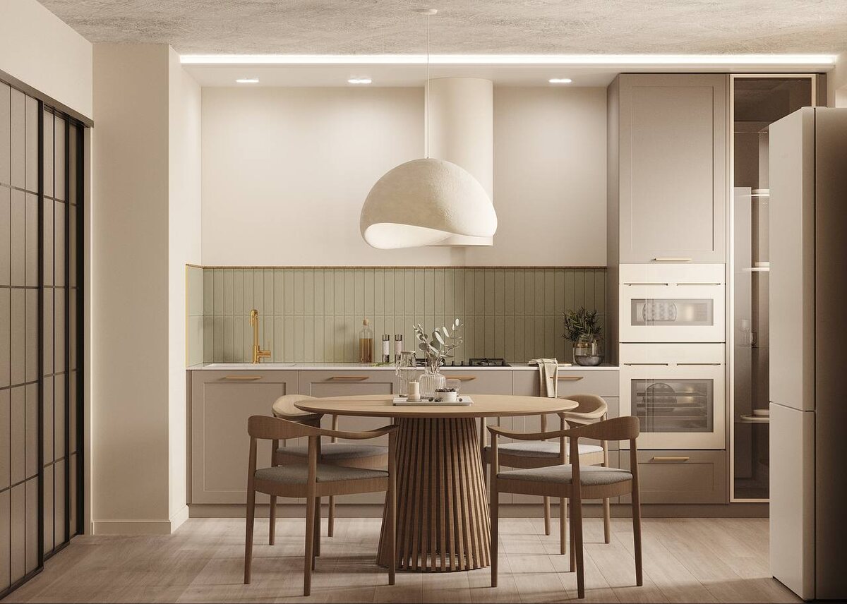 Для вашего вдохновения делюсь работой ученицы моего курса по подготовке дизайнеров интерьера с нуля, Дарьи Осипик (выполнено в 3ds Max). Давайте разберем проект по зонам, ведь здесь есть чему поучиться: ● Прихожая: смелое и глубокое решение с изумрудными стенами. Обратите внимание, как круто работает пол с эффектом «терраццо» — он связывает все оттенки в единую композицию. Арочные ниши с подсветкой добавляют пространству архитектурности. ● Гостиная: ода спокойствию и воздуху. Лаконичные стеклянные перегородки в черном профиле мягко зонируют пространство, не перегружая его. Мягкие формы дивана и абстрактное искусство на стене создают эффект «тихой роскоши». ● Кухня-столовая: мой фаворит! Вертикальная узкая плитка шалфейного цвета на фартуке — очень актуальный прием. Органический светильник над обеденной зоной и стулья с деревянной фактурой добавляют интерьеру природной теплоты. ● Лоджия: маленькое место для личного дзен. Повторение пола терраццо из прихожей создает единство всей квартир