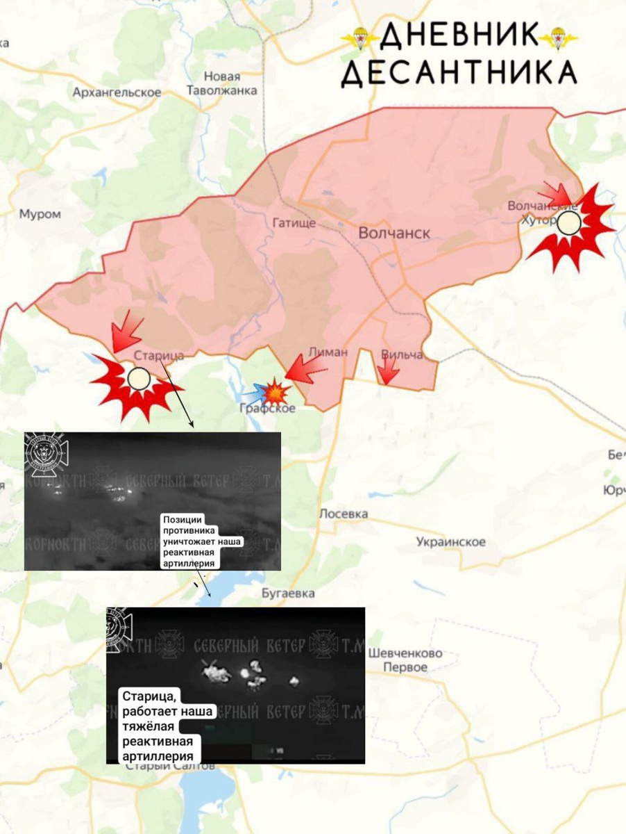 Докладывает Добрый 🫡 ВС РФ продвигаются в окрестностях Волчанска, в приграничных сёлах и лесных массивах. В связи с тем, что враг перебросил большое количество резервов на другой участок, а конкретно на Купянск, тут он испытывает нехватку личного состава, что позволяет нам продавливать оборону ВСУ. Сейчас происходит наращивание продвижения и удары стали интенсивнее. Совместная работа многих подразделений ВС РФ приносит свои результаты, удары наносим всеми имеющимися средствами, плюс задействована тяжёлая реактивная артиллерия. В Золочевском районе Харьковской области выявлено и уничтожено четыре расчета БПЛА противника, которые наносили удары по гражданскому населению Белгородской области. ▫️ Под наш контроль перешла часть населенного пункта Старица. На южных окраинах ещё присутствует противник. В районе населенного пункта продолжает работать тяжёлая реактивная артиллерия уничтожая личный состав в местах скопления. В Татарском лесу продолжаются бои. Кроме того, в районах населенны