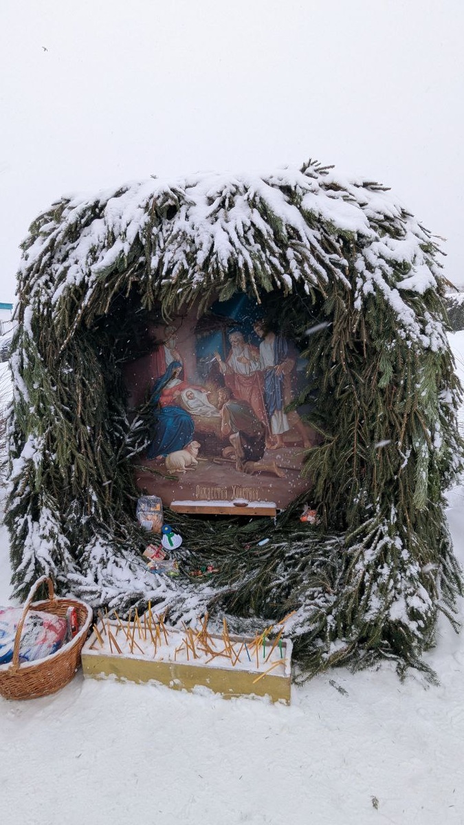В центре интересно оформленный рождественский вертеп. Обычно это фигурки в пространстве, похожем на пещеру. А здесь - икона Рождества в обрамлении еловых веток.