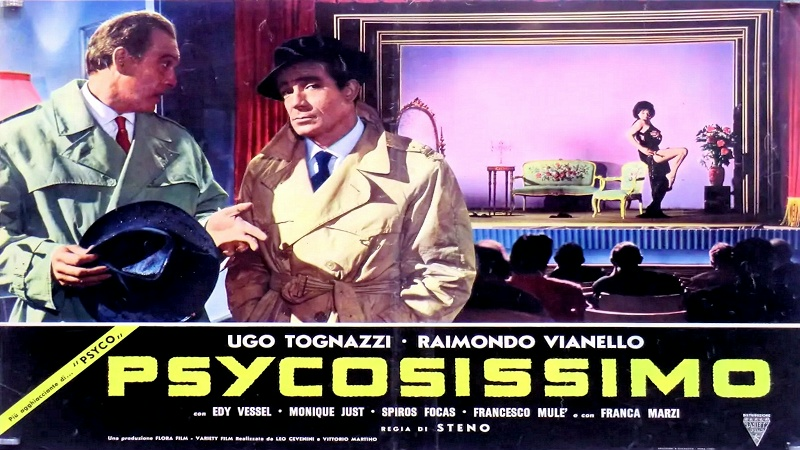 «Психозиссимо» — это очень успешная пародия на «чёрные» фильмы… Потрясающая фарсовая комедия, основанная на черном юморе, ни на секунду не сбивается с ритма от начала до конца… «Психозиссимо» остается жемчужиной итальянской комедии». Психозиссимо / Psycosissimo. Италия, 1961. Режиссер Стено. Сценаристы: Роберто Джанвити, Витторио Метц, Стено. Актеры: Уго Тоньяцци, Раймондо Вианелло, Эди Вессел, Моник Жюст и др. Комедия. Премьера: 11.02.1961. Прокат в Италии: 2,3 млн. зрителей. Прокат во Франции: 0,2 млн. зрителей. В этой комедии актеров-неудачников однажды принимают за убийц… Мнения кинокритиков о «Психозиссимо» довольно разнообразны: от безоговорочного «за» до категорического «против»: «Психозиссимо» — это очень успешная пародия на «чёрные» фильмы того периода… Потрясающая фарсовая комедия, основанная на черном юморе, ни на секунду не сбивается с ритма от начала до конца… «Психозиссимо» остается жемчужиной итальянской комедии» (Servini, 2023). «Сюжет, конечно же, представляет собой не
