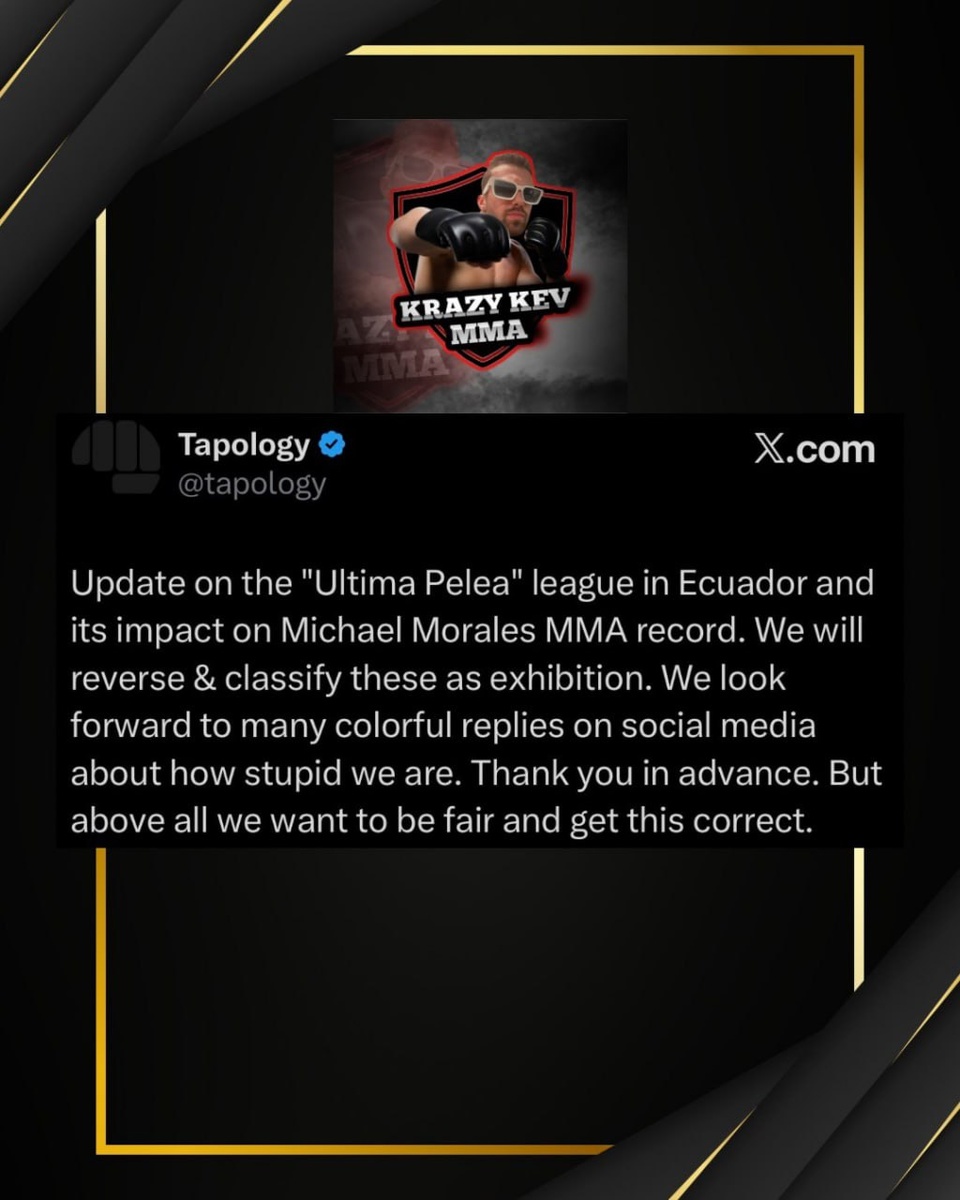 🚨 Майкл Моралес снова непобеждённый Сайт Tapology вновь обновил рекорд бойца UFC Майкла Моралеса. Два поединка, про которые все говорили сегодня, все-таки были перенесены из профессиональной статистики в любительскую карьеру, после чего его рекорд на ресурсе снова стал 19–0. Таким образом, Моралес вновь числится непобеждённым бойцом в профи. 👊 Подпишись на Meta MMA | Meta MMA в MAX | Наш канал в ВК