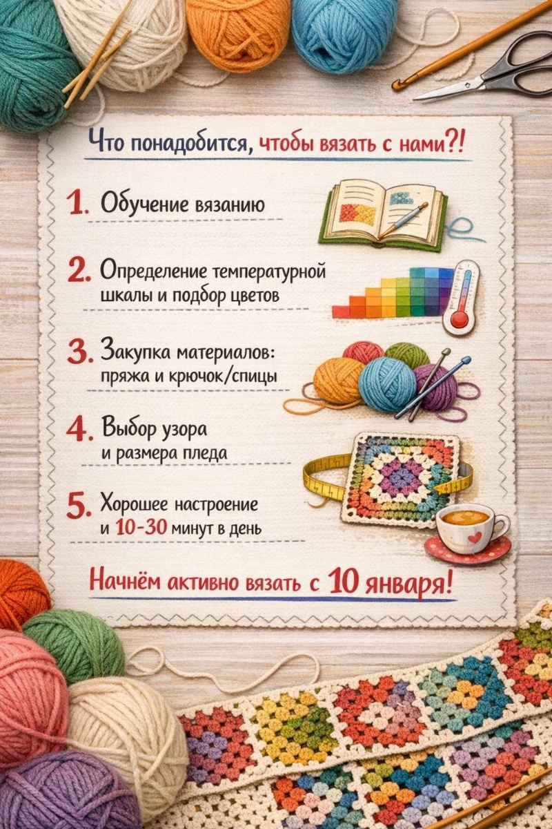 Нас уже 20 человек! 🧶🧶🧶 Если вы всегда мечтали научиться вязать или хотите создать уникальный плед, который будет отражать ваши эмоции и погоду — этот челлендж для вас: 🌸 Обучаю основам вязания - подробные интересные уроки. 🌸 Помогу выбрать цветовую палитру, которая будет отражать ваши предпочтения и настроение. 🌸 Вместе подберём пряжу и инструменты — крючок или спицы, чтобы у вас было всё необходимое для работы. 🌸 Обсудим различные узоры и размеры, чтобы ваш плед был не только красивым, но и уникальным. 🌸 Вяжем вместе с удовольствием каждый день или раз в неделю. 🗓️ Начнём активно вязать с 10 января! Ещё успеете присоединиться! 💬 Напишите в комментариях, если хотите участвовать, и я добавлю вас в группу! Ждём с нетерпением! 🧶🧶 #ТемпературныйПлед #Вязание #Челлендж #Творчество