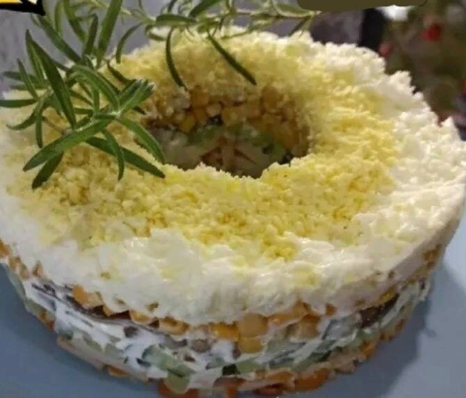 Копченую курицу мелко порезать. Яйца отварить, отделить желтки от белков. Натереть на мелкой терке. Грибы нарезать и обжарить до готовности. Огурец мелко нарезать. Выкладывать салат слоями. В центр блюда поставить стакан. Курица -огурец- шампиньоны- кукуруза- слой яичного белка. Каждый слой промазываем майонезом. Украшаем салат зеленью. Приятного аппетита!