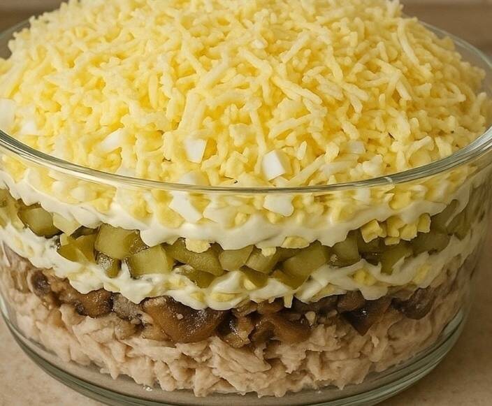 Выкладываем ингредиенты слоями. Каждый слой промазываем майонезом.