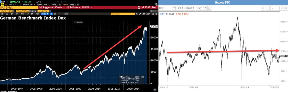 С момента запуска в 1000 пунктов в 1987 году индекс вырос примерно на 2400% — среднегодовая доходность составила 8,83%. ☝️И да начало СВО ударило по экономике Германии, энергоносители подорожали, производства ринулись в США, засилие иммигрантов, закрытие крупнейших заводов и прочее и прочее. 😭 Но их медведи всё равно горько плачут... Ведь у них нет своей Набиулиной :)