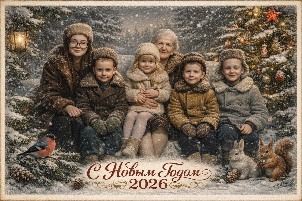 И каждый год мы собираемся у нее дома и отмечаем. Почти всегда скромно и тихо, но с каждым годом нас становиться больше. У бабушки 2 детей, 5 внуков и 13 правнуков. Сегодня в одном доме сразу 4 поколения одной семьи собрались за столом. Сделала открытку только с теми детьми, которые были с нами сегодня. Надо будет собрать всех и сделать такое фото уже со всеми. Промт оставлю в комментариях