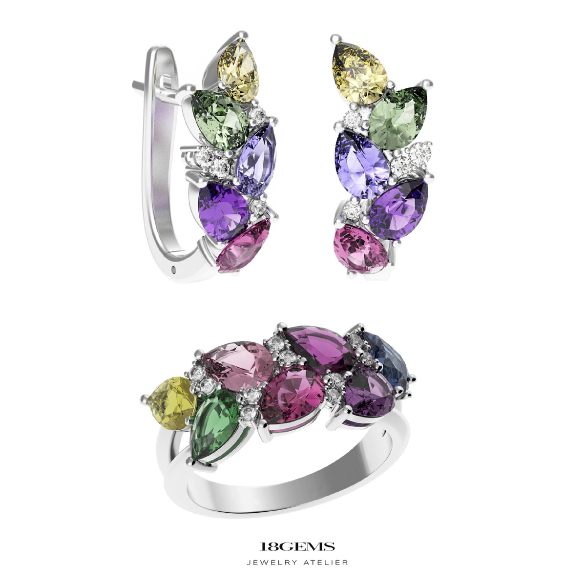 В конце уходящего 2025 года мы реализовали индивидуальный проект, в основу которого легли сапфиры в огранке груша разных оттенков, родом из Мадагаскара. Важная особенность этих камней в том, что их оттенок полностью природный, без какого-либо облагораживания. Камни отличаются высоким уровнем чистоты и прозрачности, что в сочетании с качественной огранкой даёт яркий блеск.