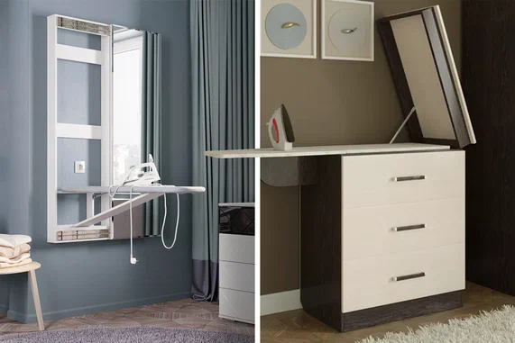 Не всегда есть возможность или желание делать шкаф на заказ, тогда на помощь приходит трансформирующаяся мебель — комод с выдвижной или откидной гладильной доской.