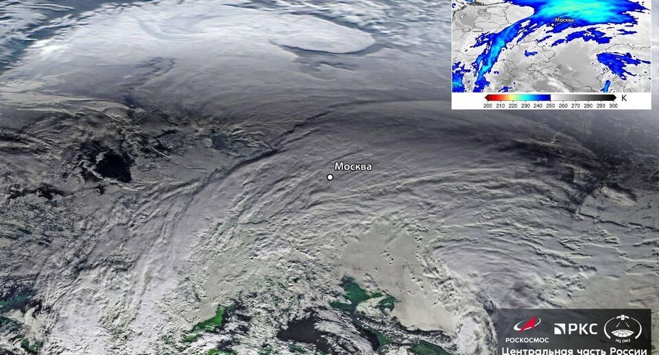 Космические аппараты «Роскосмоса» передали снимки циклона, движущегося в направлении Москвы. Соответствующий кадр появился в официальном Telegram-канале корпорации. Метеорологи предупреждают о надвигающейся непогоде с обильными снегопадами. Погодные условия обещают быть экстремальными. На опубликованном фото видно, что к Москве приближается и уже частично закрывает огромное плотное снежное облако. По прогнозам специалистов, количество выпавшего снега превысит 50% от обычной месячной нормы. В настоящее время экстренные службы и коммунальщики столицы готовятся к значительному ухудшению погодных условий. Изображения циклона получены с метеорологических спутников «Электро-Л» и «Арктика-М», ведущих постоянное наблюдение за атмосферными процессами. Ранее жителей Москвы и гостей российской столицы предупредили о приближающейся непогоде. В связи с этим в городе ввели «желтый» уровень погодной опасности. Автомобилистам в очередной раз напомнили о необходимости соблюдать правила дорожного движен
