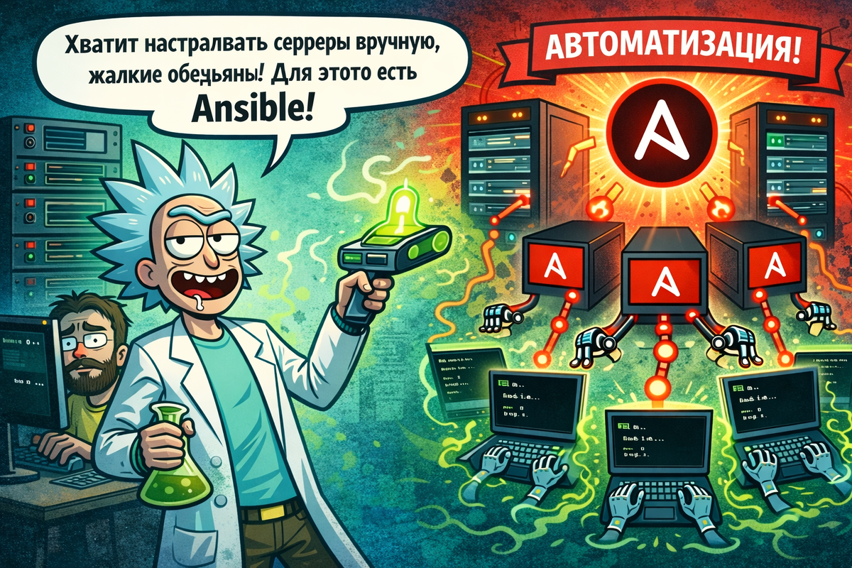 Привет. Не волнуйся — я не твой учитель, не наставник и уж точно не твой друг. Но если ты до сих пор настраиваешь серверы вручную, как будто живёшь в эпоху дискет, то, возможно, тебе стоит взглянуть на то, как работают те, кто уже давно перестал тратить время на повторяющиеся действия. Ansible — это не просто инструмент. Это способ сказать своей инфраструктуре: «Будь вот такой. А не такой, как ты есть». И она послушается. Без установки агентов. Без сложных зависимостей. Просто — через SSH и немного чётко написанного кода. Ты описываешь желаемое состояние, а Ansible делает всё остальное. Запустил один раз — получил рабочую систему. Запустил ещё раз — ничего не сломалось. Это называется идемпотентность, но тебе не обязательно запоминать это слово. Главное — эффект. Есть плейбук? Отлично. Теперь твоя инфраструктура — как сценарий фильма: воспроизводима, предсказуема и легко тестируема.