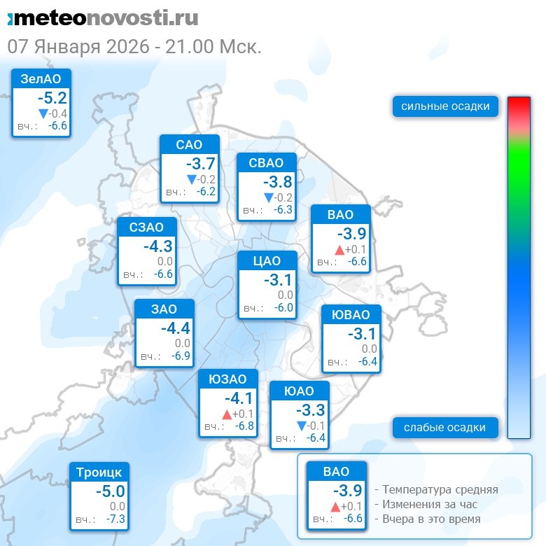 В 21:00 в Москве было от -5.4°C до -2.2°C, средняя температура -3.8°C #погода #Москва #зима #температура #7января #среда