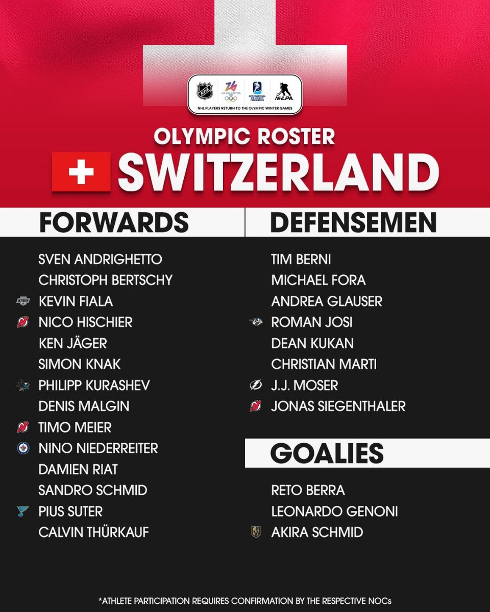 🏒 Сборная Швейцарии опубликовала состав на олимпийские игры в Милане. #NHL