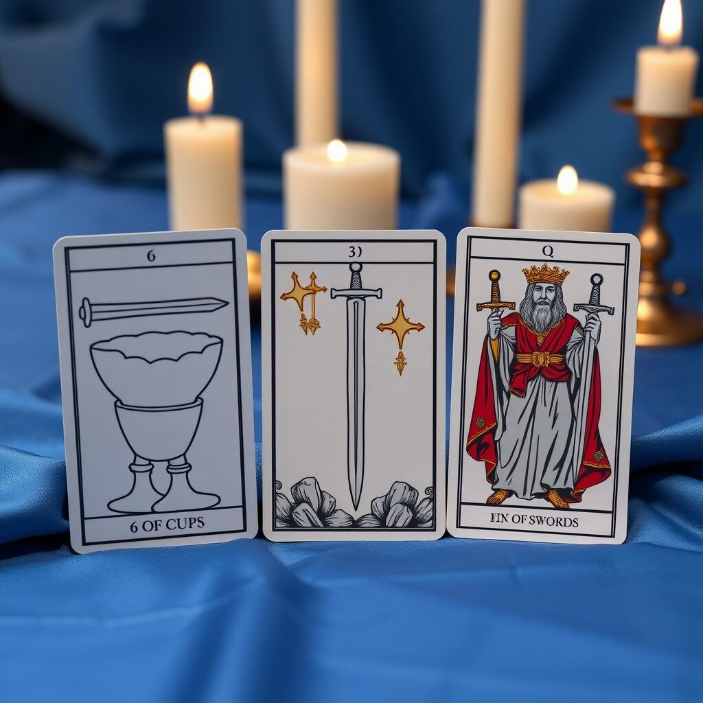 Этот расклад — это настоящая драма в трех актах, которая показывает его внутреннее состояние без прикрас. Ему очень плохо. Короткий ответ: Ему без вас невыносимо больно, но он отчаянно пытается подавить эти чувства холодным разумом и логикой. Это внутренняя война между сердцем, которое помнит прошлое, и разумом, который пытается отрезать это прошлое. А теперь давайте разберем эту историю подробно. Его состояние начинается не с настоящего, а с глубокого погружения в прошлое. Его разум постоянно возвращается к вам, но не к конфликтам или проблемам, а к самым светлым и нежным моментам, которые были между вами. Ностальгия — это ловушка. Каждый раз, когда он возвращается из этих теплых воспоминаний (6 Кубков) в настоящее, реальность наносит ему жестокий и болезненный удар. И как же он справляется с этой невыносимой болью (3 Мечей), вызванной сладкими воспоминаниями (6 Кубков)? Он надевает маску. Маску Короля Мечей. Как ему без вас? Это постоянный, изматывающий цикл. Он уходит в мир прекрас