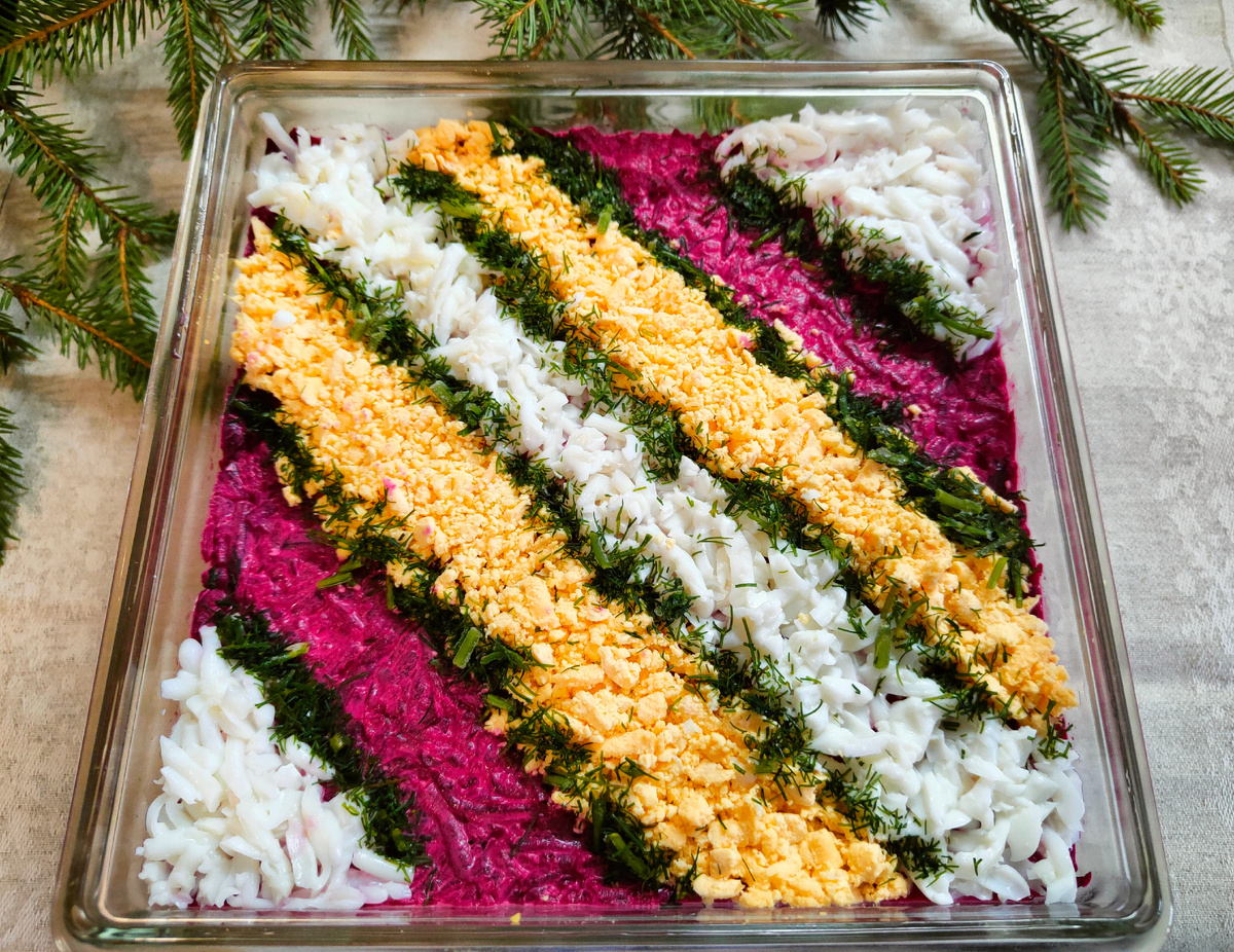 В заключение украшаем салат по своему вкусу. Для декора как на главном фото я использую шаблон, вырезанный из картона. Разделяю яйца на белки и желтки, отдельно натираю на тёрке и выкладываю полосками. Дополнительно слегка присыпаю стыки измельчённым укропом: