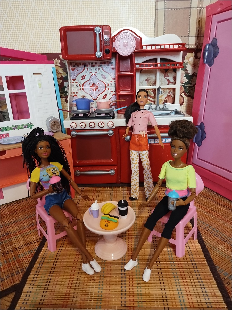 Всем доброго дня! Сегодня у нас статья о быте в моем Барби-Ленде. Я уже давно купила кукольный кухонный набор, такой классный, что мне не терпелось его показать зрителям блога. Но все не предоставлялось случая, очень много других тем на повестке, более актуальных, вон сколько Новогодних и Рождественских праздников. И к ним у меня тоже полно кукол и интересных сюжетов. Но сегодня я наконец решила сделать сюжет о нашей кухне. И для него выбрала три куколки Барби: две МТМ девочки-шоколадки, Бруклин и Йогу. И еще одну Барби из серии :Кем ты можешь быть - повара. К сожалению, где-то затерялся ее колпак шеф-повара, но я уже решила сделать фото и без него. Встречаем - мои девочки на кухне Бруклин и Йога сидят на розовых стульях и пьют соду из своих кружек На столике у них типичный американский набор еды: хот-дог, пицца, бананы. Бруклин любит вредные напитки, увы Обратите внимание на ее футболку - Губка Боб. Бруклин вобще модная и боевая девчонка. Переходим к Барби- Повару. Я не знаю точно чт
