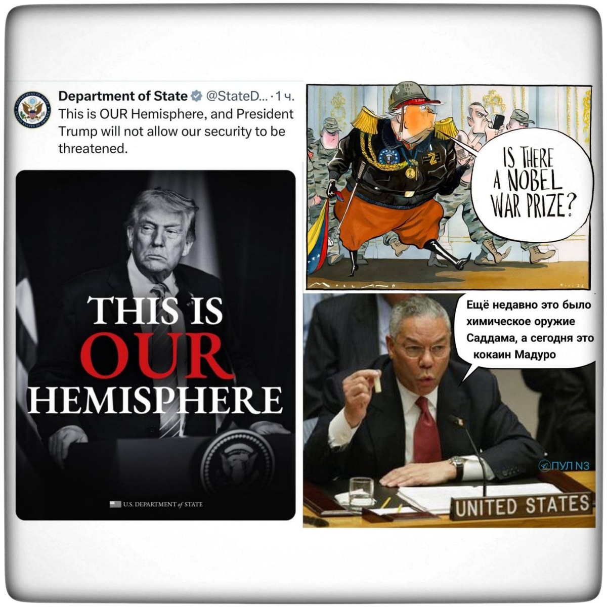 США возомнили себя мировым жандармом и высшим судьёй, вторгаясь в любые страны, определяя виновных, назначая им наказания и приводя их в исполнение, поправ международное право. США обогащается за счёт слабых любой ценой и любыми средствами, грубо нарушая международное право. В ход идут любые инструменты: санкции, рейдерские захваты кораблей, самолётов, президентов и даже стран, если потребуется. Для них нет ни законов, ни принципов, а есть только одно правило – кто сильнее, тот и прав. США не договороспособны. Любые соглашения действуют лишь до тех пор, пока они выгодны США. Как противостоять международному разбойнику? С помощью закона (Горбсуд.рф) и силы (Межконтинентальные.рф). Важно также единство всего международного сообщества. На фото: 1. Плохие новости для жителей Гренландии, Мексики и всех остальных, оказавшихся в Западном полушарии. Пресс-служба Госдепа США написала в X, что Западное полушарие является зоной влияния США: «Это наше полушарие, и президент Трамп не позвол