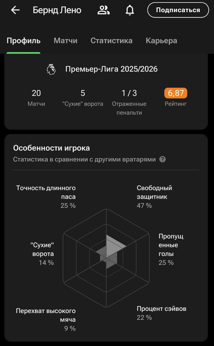 Лено в этом сезоне за Фулхэм не впечатляет: из 26.3 xGoT — 29 пропущенных. "Перепропустил" почти на 3 гола больше.
