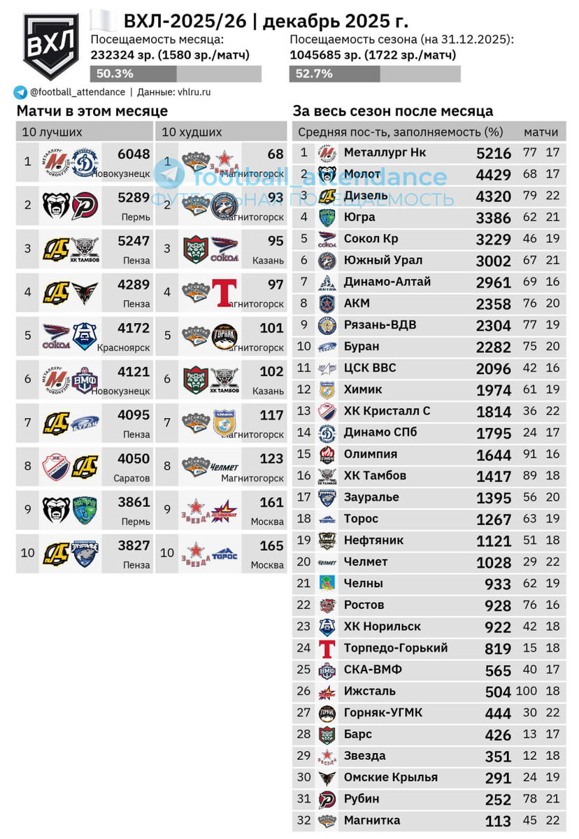 В декабре в списке арен «вышки» состоялось долгожданное пополнение: ХК «Ростов» наконец-то переезжает в Ледовый дворец. • В целом, аудитория матчей в декабре (1580 зр./матч в среднем) оказалась на 8% ниже средней в сезоне (1722). • Максимальное число зрителей на играх «вышки» в декабре традиционно приходило в Новокузнецке, Перми и Пензе. В топ-10 также попали домашние матчи красноярского «Сокола» и саратовского «Кристалла». • Наименьшая публика ожидаемо собиралась на молодёжных составах магнитогорской «Магнитки», казанского «Барса» и столичной «Звезды». Посещаемость месяца Заполняемость стадионов