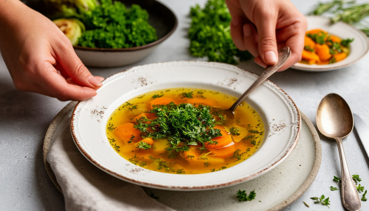 Почему полезно: тёплый прозрачный бульон мягко стимулирует пищеварение, восполняет жидкость и даёт ощущение сытости без перегрузки.