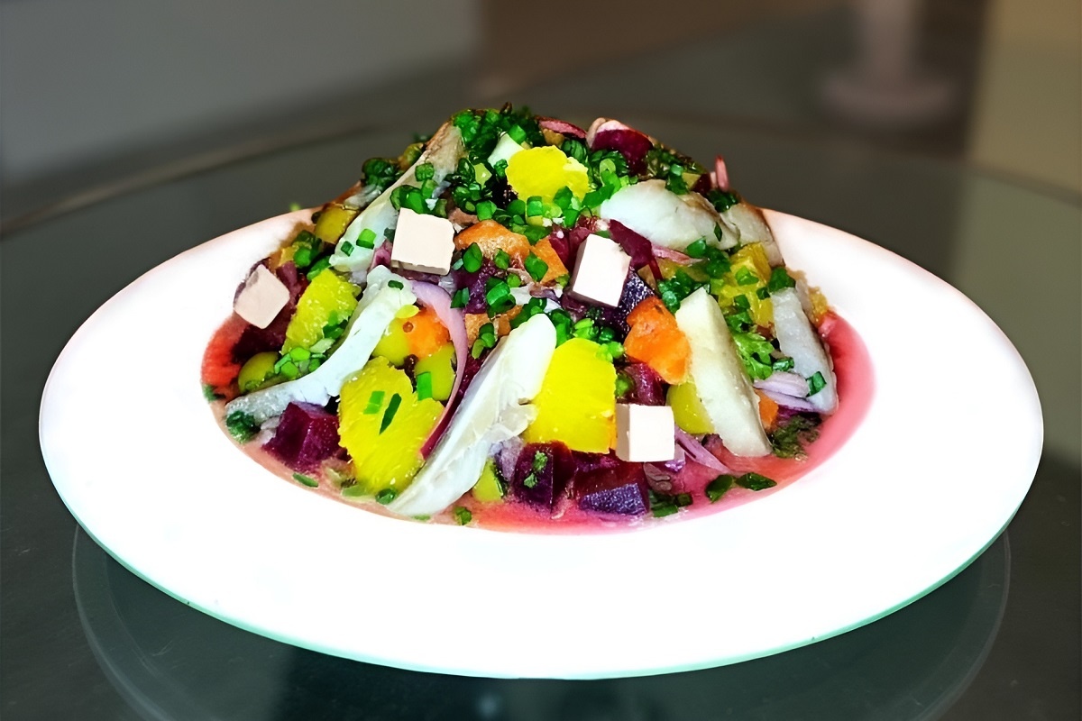 Мой дорогой друг и просто любитель неординарных рецептов! Салат, который я предлагаю сегодня — настоящий кулинарный шедевр, который переносит нас в атмосферу смелых и свежих гастрономических открытий! Это блюдо мастерски играет на контрастах: землистая сладость запечённой свёклы встречается с солёной, пикантной нотой сельди, а цитрусовая кислинка апельсина нежно балансирует эту пару. Особое очарование рецепту придают изысканные детали: тончайшие слайсы красного лука, быстро маринованные в лимоне для мягкой остроты, и яркая, ароматная заправка с добавлением горчицы и мёда. В финале, кубики сыра Фета придадут необходимую кремовую текстуру, а базилик и орегано в соусе добавят неожиданный, средиземноморский акцент. Это не просто салат, это целое гастрономическое приключение, которое гарантированно удивит вас и ваших гостей своей многогранностью и гармонией вкусов! Сначала займёмся овощами. Заворачиваем морковь и свёклу в фольгу и запекаем до готовности. Можно и отварить (раздельно), но в