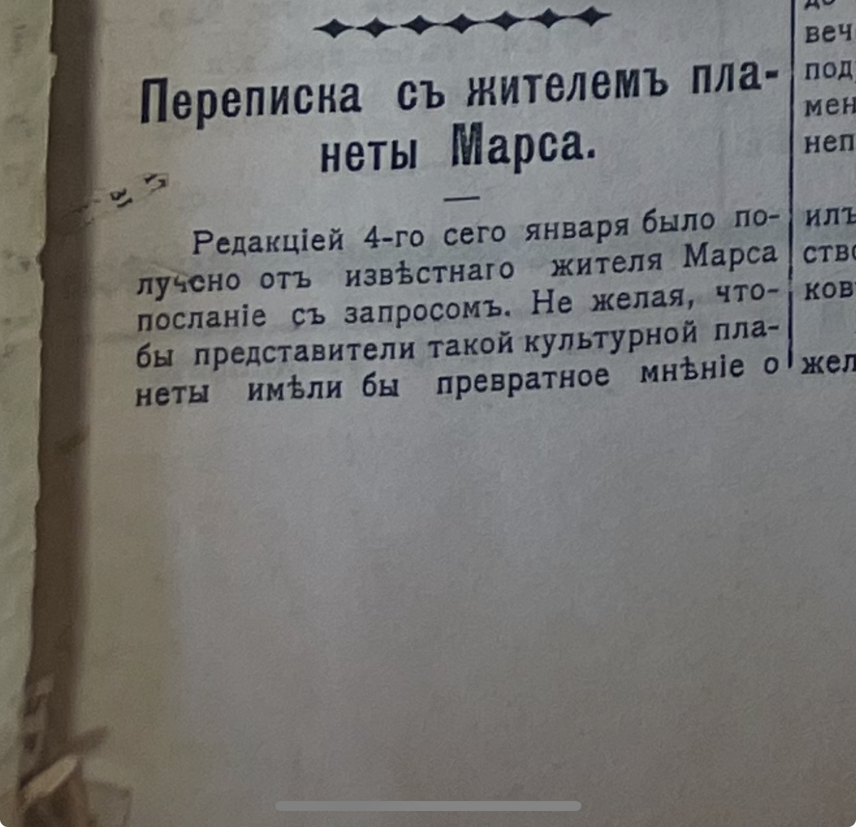 Редакцией 4-го сего января было получено от известного жителя Марса послание с запросом 👆🏻. Не желая, чтобы представители такой культурной планеты имели бы превратное мнение о некультурности нашей планеты, Земли, редакция решила ответить ему тоже в поэтической форме изложения, для каковой цели экстренно был вызвано сотрудник г. Сердечный.