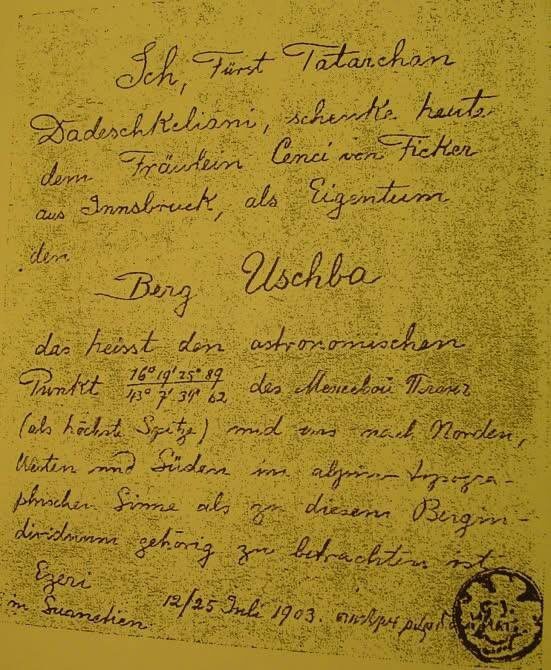 Дословно Ушба переводится со сванского как "горе-гора". На ее счету более 60 смертей и уйма пропавших без вести. У горы две вершины, северная 4690 м и южная 4710 м. Маршруты восхождений имеют категории сложности от 4А до 6А. Есть и такие маршруты, которые были пройдены лишь однажды. Впервые Ушбу покорили в 1888 году. Между вершинами находится перемычка, которую называют "труба" - там всегда очень ветрено. В 1903 году в Сванетию приехали альпинисты и в группе из 14 человек была одна дама-альпинистка, редкость в те времена. Австрийка Ченчи фон Фиккер покорила не только гору, но и местного князя - Татархана Дадешелиани. И тот, от широты грузинской души сделал ей подарок - саму гору Ушбу! И даже дарственную написал, которая сейчас хранится в семье альпинистки. Говорят, сваны разозлились из-за такой дерзости князя. А тот отшутился: «Гора как стояла, так и стоит, а женщине приятно».