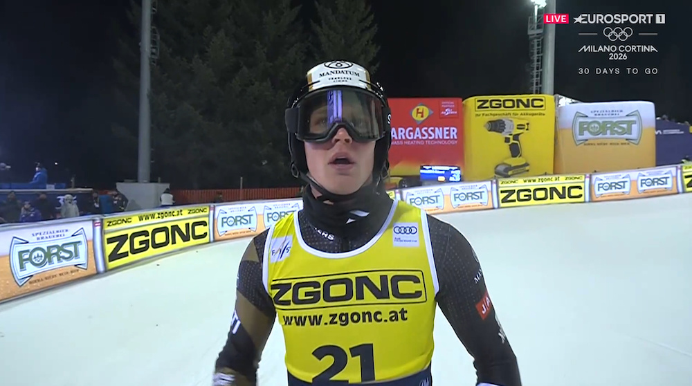 22-летний Ханс Граль-Мадсен прошел во второй заезд с 39-м номером. Норвежец стартует с запасом в 10 сотых, пока достойно борется с лидерами. Но на второй половине дистанции начинает проигрывать, а потом попадает в ловушку австрийского тренера, заваливается на бок и сходит с трассы. А мог быть хороший результат. Из 18 стартовавших семь горнолыжников сошли с трассы