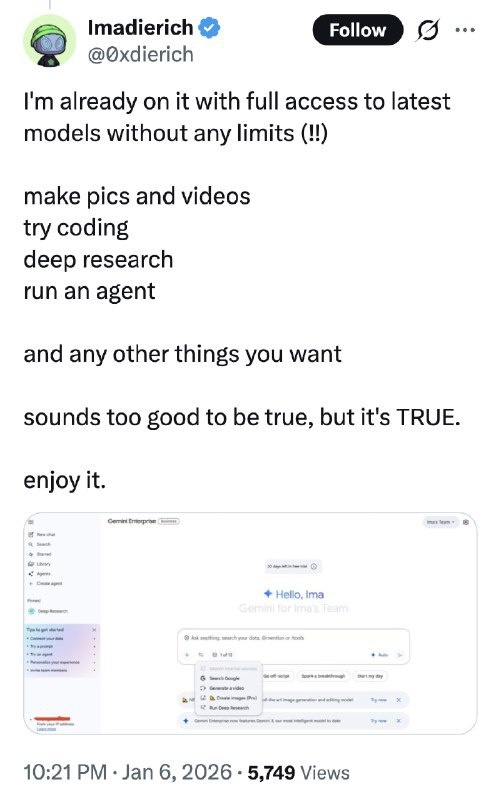 задачи. Есть чёткая схема — без мутных телодвижений и лишней боли. Коротко: доступ ко всем топовым нейросетям открывается сразу на целый МЕСЯЦ. 1️⃣ Заходим на сайт Гугла — тут. 2️⃣ Находим «Choose your edition». 3️⃣ Жмем «Start 30-day trial». 4️⃣ Заходим на сайт через свой Gmail. Успевайте, пока эту историю не прикрыли и праздник щедрости не закончился. Подробнее: https://hard-tm.su/threads/139228/ 🕹HARD-TM — Подписаться
