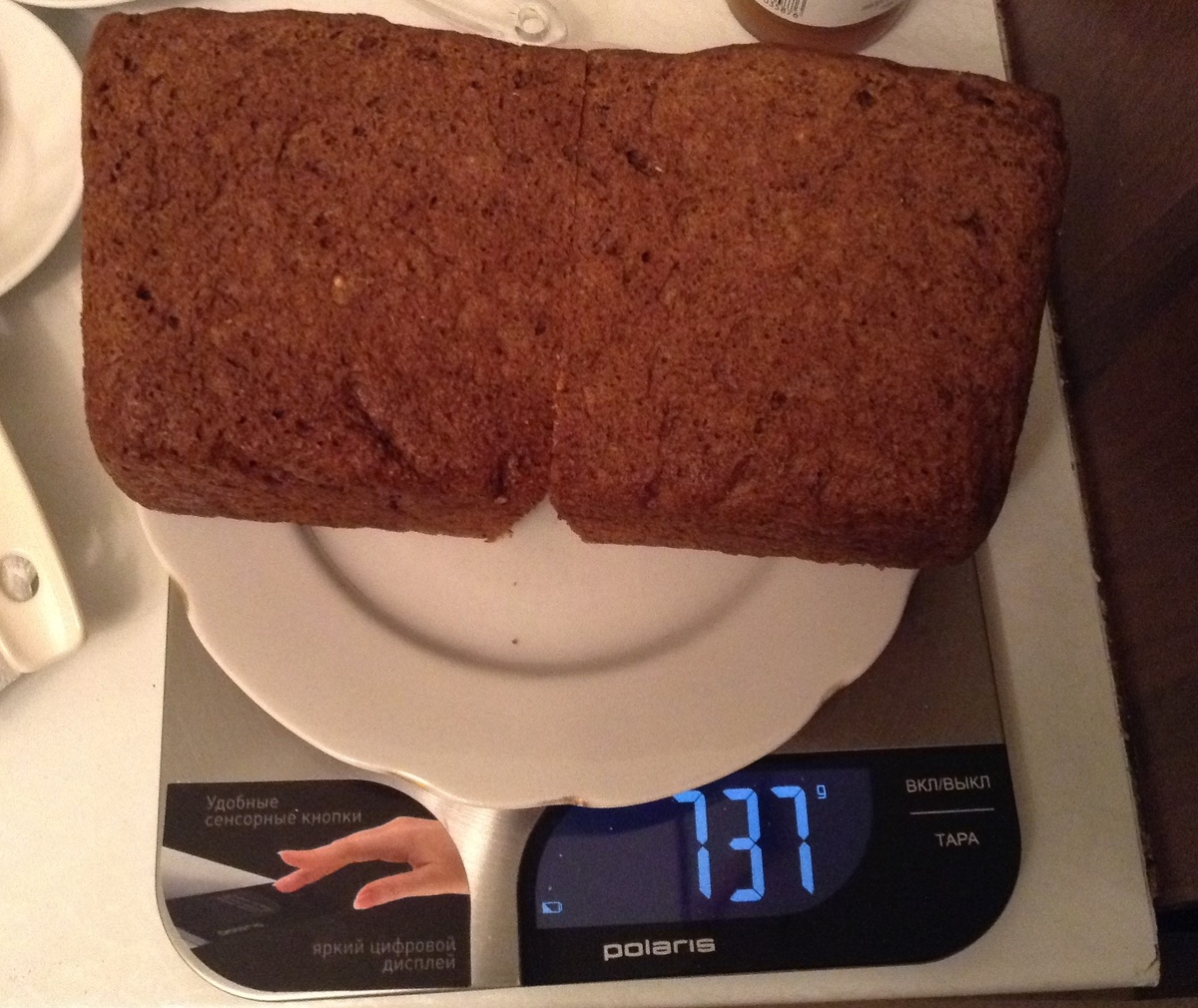 Форма хлеба получилась классическая, вес буханки составил от 716 г до 737 г, производитель обещает вес готового хлеба от 700 до 750 г.