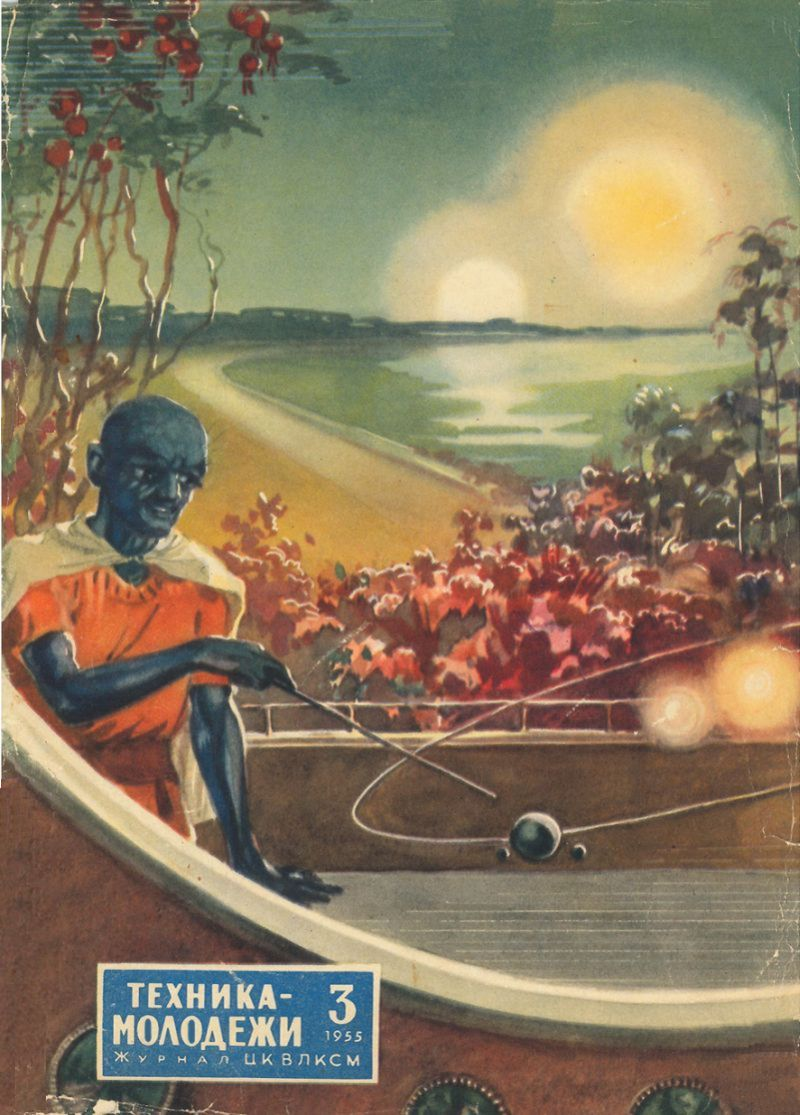Обложка журнала «Техника — молодёжи», 1955, № 3. Так в то время представляли себе жителя далёкой планеты, освещённой двумя солнцами. Иллюстрация к научно-фантастическому рассказу, помещённому в номере