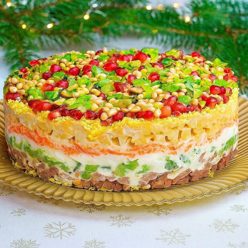 ✅ Для эффектной подачи можно выложить салат в виде венка или в порционных кольцах.