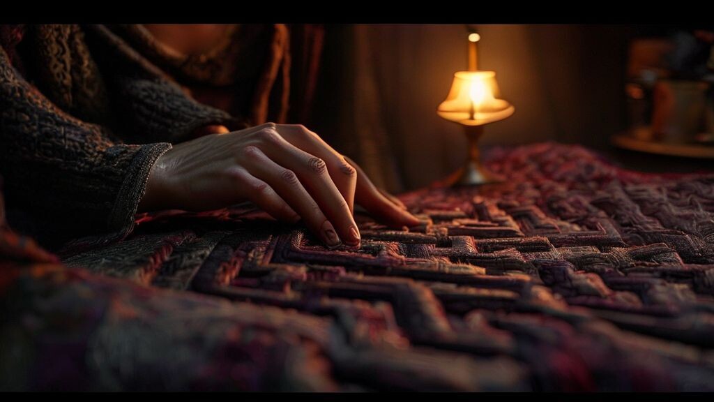 На коленях у неё лежал рулон плотного льняного полотна, холодный и тяжелый, как свинец. Шкатулка с нитками стояла открытой, и в свете настольной лампы мотки шёлка отливали сотнями оттенков: здесь был не просто красный, а цвет увядающей герани, не просто синий, а глубина предрассветного неба за минуту до первого луча. Анастасия выбрала самую тёмную, почти чёрную с фиолетовым подтоном, и начала намечать контур. Иголка входила в ткань с тихим, упругим шорохом, оставляя за собой пунктирную линию. Она вышивала лабиринт.