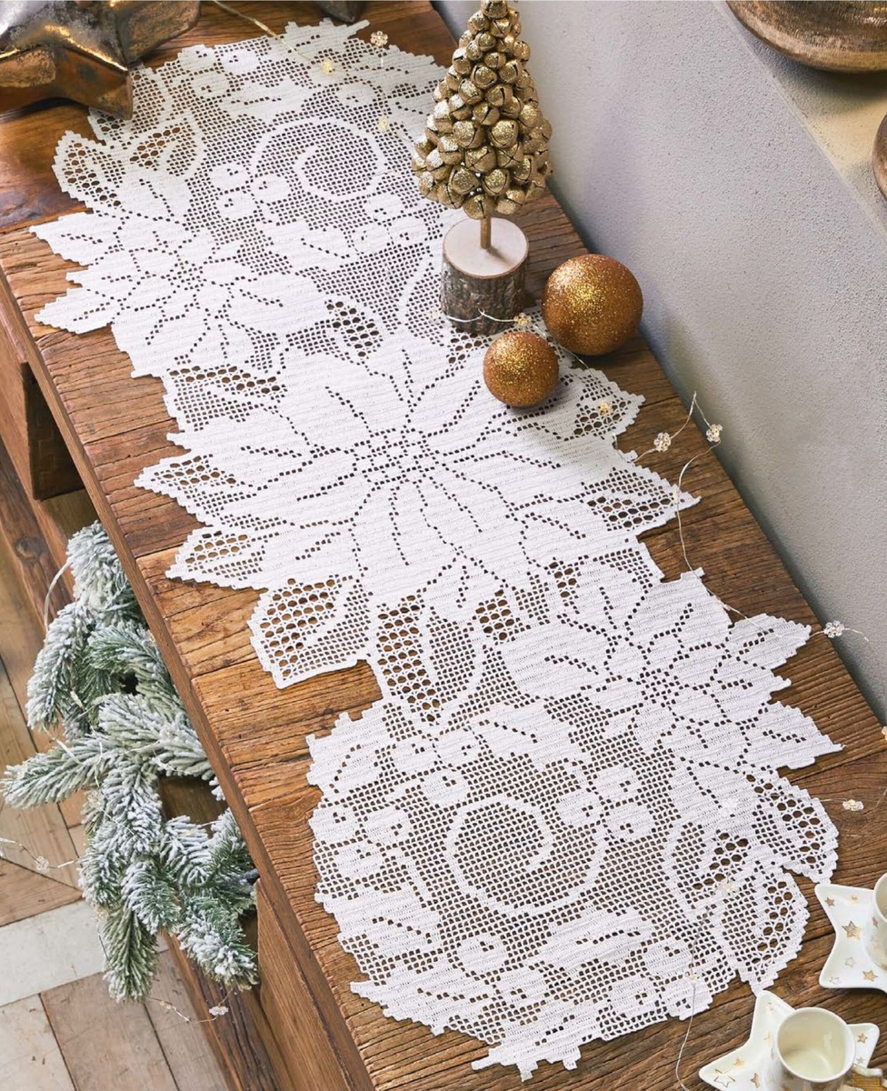 В сегодняшней подборке я постаралась собрать изделия, которые вяжутся в филейной технике и содержат в своём рисунке именно цветок пуансеттии. Первые 2 дорожки наверняка вы часто встречали в интернете. Они абсолютно разные. Например, первая дорожка имеет более набитый, плотный рисунок.
