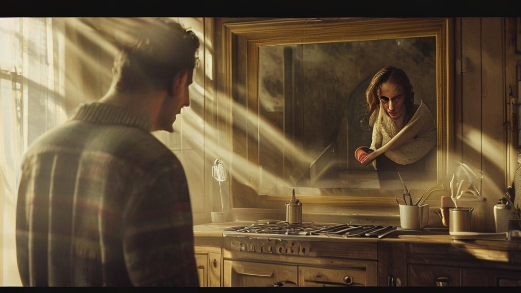 «С днем рождения, любимый», — произнесла она голосом, в котором не дрогнула ни одна нота. Она стояла у раковины, мыла кружку, и ее профиль на фоне окна был идеально спокоен. Я потянулся к свертку, и плед соскользнул с жесткого прямоугольника холста. Сначала я не понял, что вижу. Мозг регистрировал знакомые черты: мое собственное лицо, отраженное в большом зеркале в нашей прихожей, тот самый свитер с оленем, который я надел сегодня. Я на картине был запечатлен в момент завязывания шнурка. И за моей спиной, в отражении этого же зеркала, стояла Лика.
