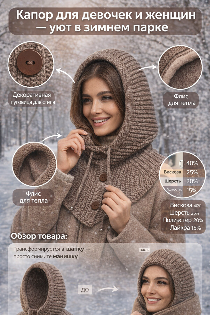 В холодное время года каждая женщина и девушка мечтает о комфорте и стиле. А что если объединить это в одном аксессуаре? Знакомьтесь: капор для девочек и женщин — универсальный головной убор, который защитит от ветра, мороза и добавит шарма любому образу. Этот вязаный капор с пуговицами и флисовой подкладкой стал хитом сезона 2026 года. Артикул на маркетплейсе — 4810539565, цвет коричневый (507), но доступны и другие оттенки. Состав: вискоза 40%, шерсть 25%, полиэстер 20%, лайкра 15%. Утеплитель — мягкий флис, декор — декоративные пуговицы и шнуровка. Идеален для зимы и осени! Представьте: вы выходите на прогулку в заснеженный парк, а ваш зимний капор женский надежно укутывает голову и шею. Нет больше замерзших ушей или продуваемого горла! Этот аксессуар не просто шапка — он трансформируется в шарф или манишку благодаря съемным элементам. Женский капор с пуговицами сочетает традиции и современность. Вязаная модель с подкладкой из флиса обеспечивает тепло даже в -20°C. Шерсть в составе
