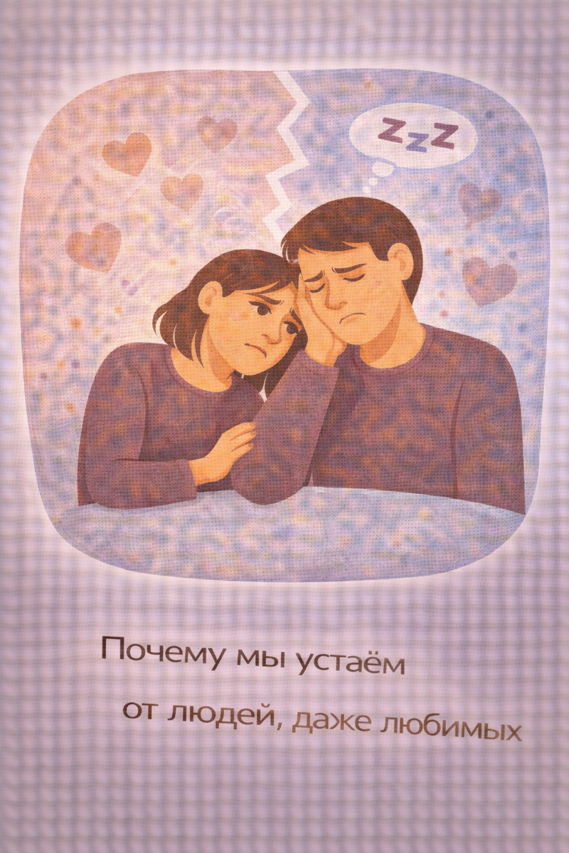 Любовь не освобождает от ограниченности ресурсов. Она лишь делает контакт более значимым — а значит, и более энергозатратным. Усталость от близких — это не отказ от связи, а сигнал о необходимости баланса между «быть с» и «быть собой».
