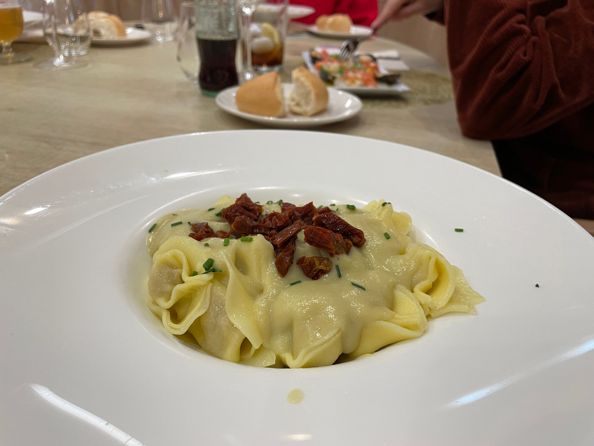 Вообще, хотелось бы уже отойти от темы еды. Но пока не получается. Хотя ко мне уже понемногу вернулось желание что-то есть. Я уже даже завтракаю, обедаю и ужинаю. Но ужас от воспоминаний о праздничной обжираловке не отпускает. И так получилось, что сегодня опять будет про праздничную еду. Вернее, про забавную ситуацию в ресторане. Я уже много раз писала о том, что не ем мяса. Уже двадцать лет. Мне так лучше, я никому не навязываю. Мой организм не может переваривать такую пищу. Раньше я плохо себя чувствовала, была вялой, уставшей... долго перечислять. Смысл в том, что это не прихоть, не идея спасти весь мир, а особенность моего организма. В праздничные дни родственники устраивают большой семейный обед в ресторане. Традиция у них такая. И, выбирая ресторан, обычно смотрят, чтобы для меня там что-то было. В этот раз я нашла только одну позицию, которая выглядела вполне вегетарианской. Это были тортеллини с бурратой и шпинатом. Люблю итальянскую кухню именно за то, что всегда нахожу там ч