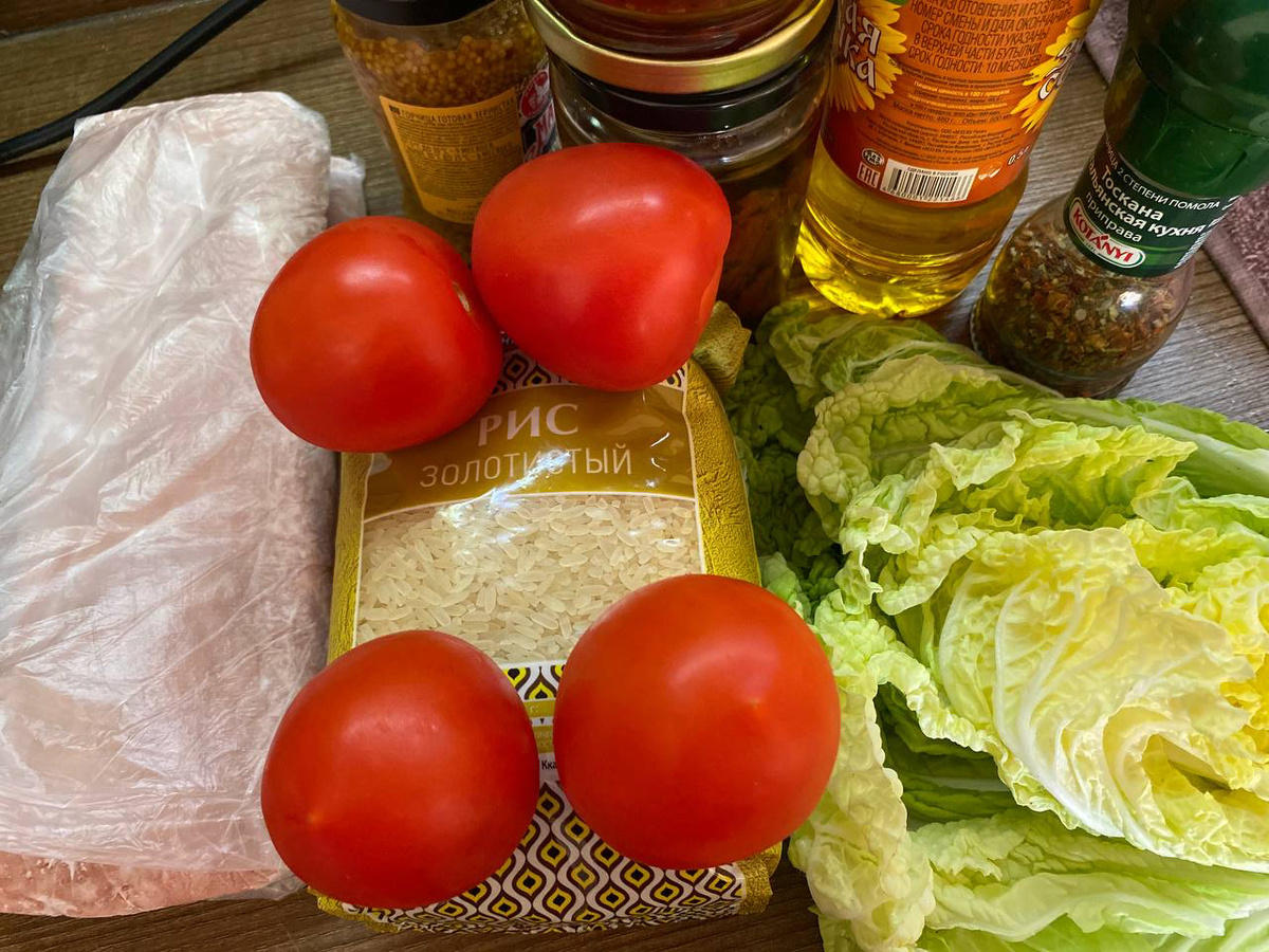 - в большой миске смешиваем куриный фарш, отварной рис, капусту, лук, помидоры, каперсы, вяленые томаты и французскую горчицу;