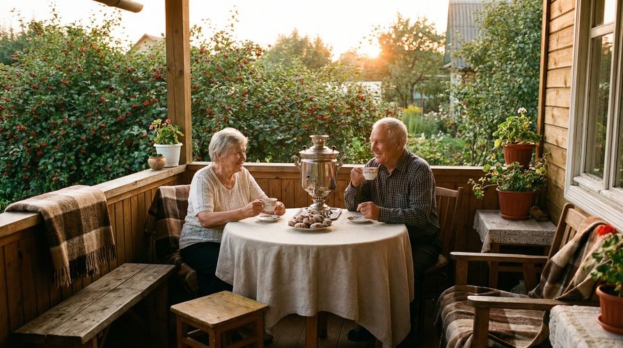 Однажды теплым августовским вечером Марина сидела на крыльце, перебирая ягоды. Калитка скрипнула. Вошел Геннадий. В руках он торжественно нес пузатый, начищенный до блеска электрический самовар, а под мышкой — пакет с пряниками.