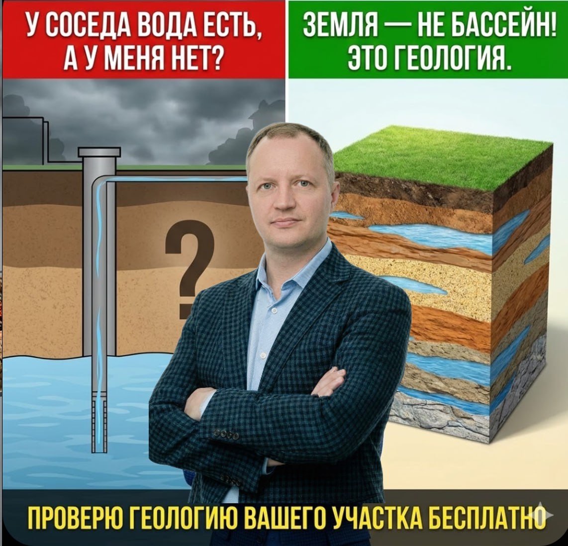 Одна улица. Меня развели? Это не паранойя — это очень частый вопрос, который я слышу от клиентов после бурения. И халтурщики этим пользуются: они ХОТЯТ, чтобы вы думали, что проблема в вас, а не в их работе. 🌍 Вы не понимаете одну вещь про воду под землёй Земля — это не бассейн с ровным дном. Это слоёный пирог из скального грунта, глины, песка, трещин и жил. И вода течёт там, где есть трещины, пустоты, линзы проницаемого грунта. Вода добывается из трещин и разломов в этих породах. И залегают они на разной глубине. Именно в связи с неоднородностью ландшафта под землей и вариативностью залегания водоносных горизонтов, глубина скважин на соседних участках отличается. А итоговая конструкция скважины рассчитывается только после бурения, по фактической глубине и расходу труб. Даже в одном СНТ, на одной улице, между соседними участками могут быть: – разные водоносные горизонты (один попал на 40 м в мощный, другой на 50 м в слабый); – разная толщина водоносного слоя (у одного 8 метров н